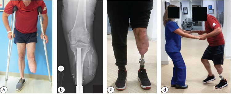 Figure 2. Transtibial osseointegration: a — preoperative photograph identifies this patient is using two crutches to locomote because of his inability to wear a socket prosthesis due to pain; b — X-ray in the anterior-posterior view depicting the transtibial osseointegration implant; c — standing photograph of the patient following transtibial osseointegration; d — photograph showing the patient feeling comfortable and enthusiastic enough to initiate a dance with the nurse during the postoperative visit. Note that the patient is able to plant on the osseointegrated limb confidently enough to lead his partner while having his intact leg off the ground