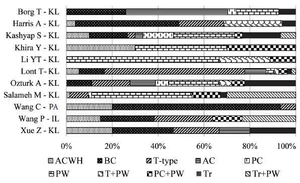 Fig. 2. Classification of acetabulum fractures according to Judet-Letournel in the cited sources. Percentages indicate the proportion of acetabulum fractures types from their total number