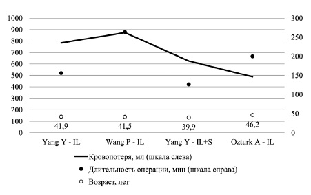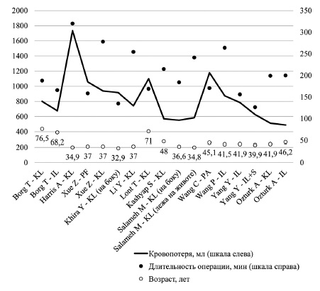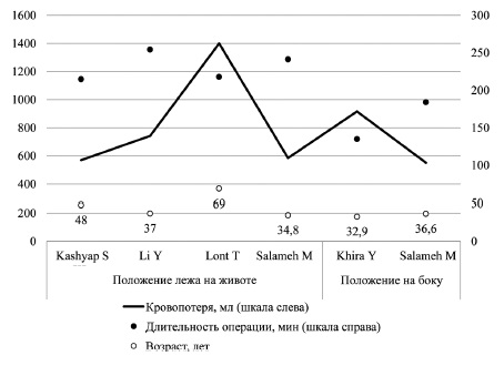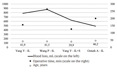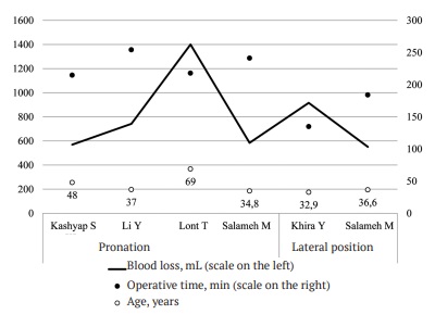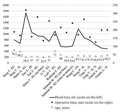 Author | Observation period | Surgical approach | Number of patients | Age, years | Operative time, min. | Blood loss, ml |