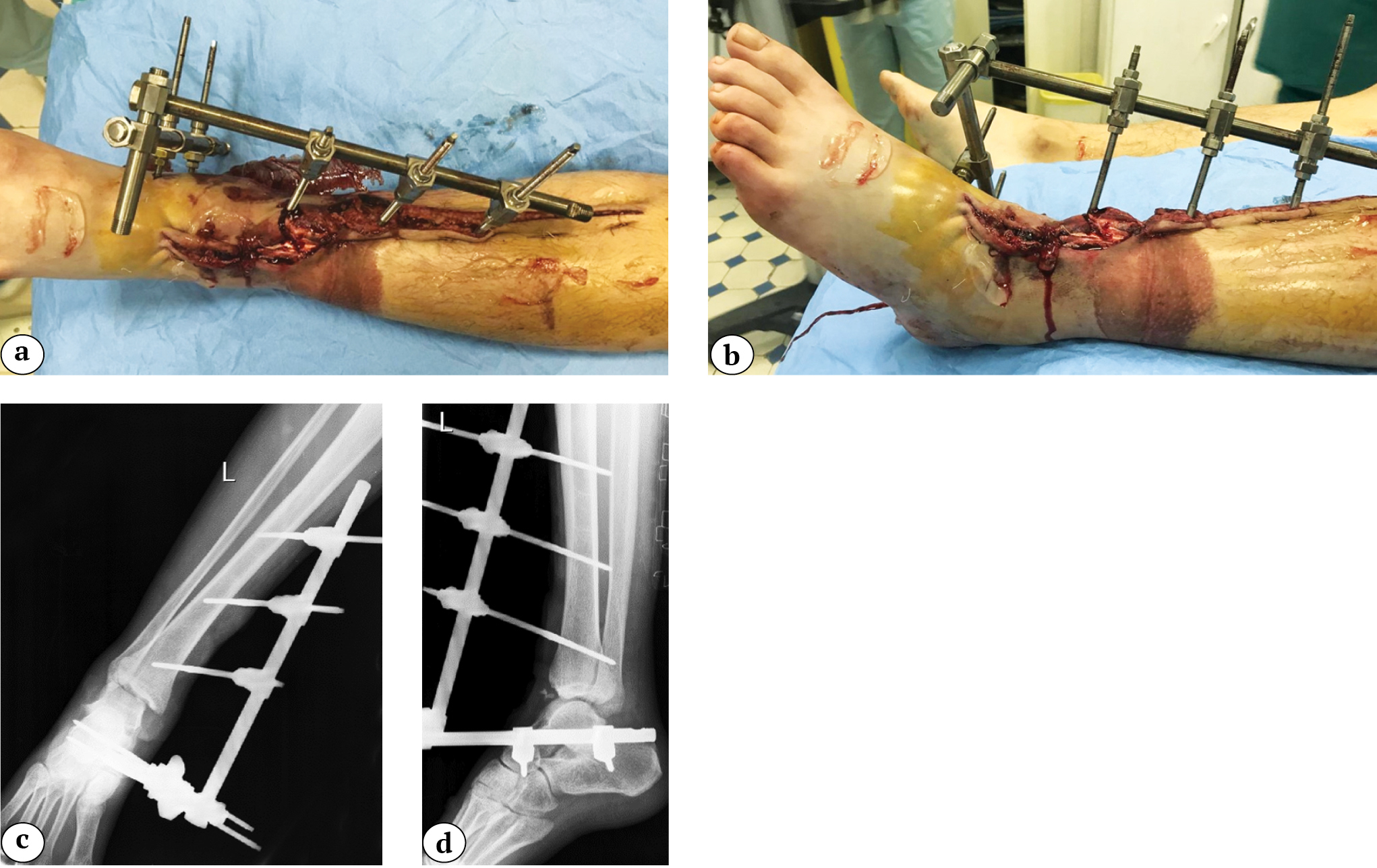 Fig. 1. Patient’s left lower limb fixed with an external fixator: a, b — general view; c, d — X-ray images of the left lower limb and foot in two views