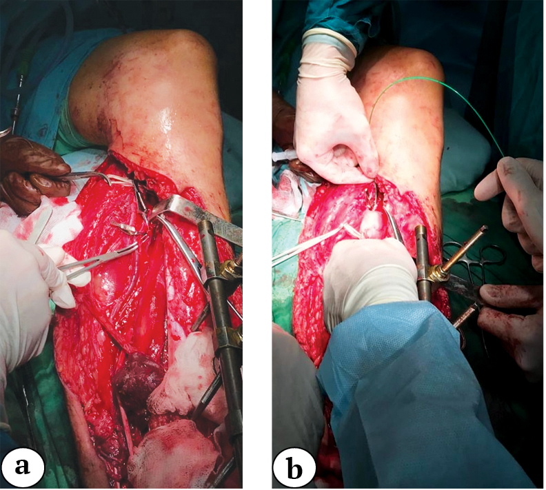 Fig. 2. Stages of posterior tibial artery thrombectomy: a — isolation of the posterior tibial artery; b — insertion of the Fogarty catheter into the posterior tibial artery
