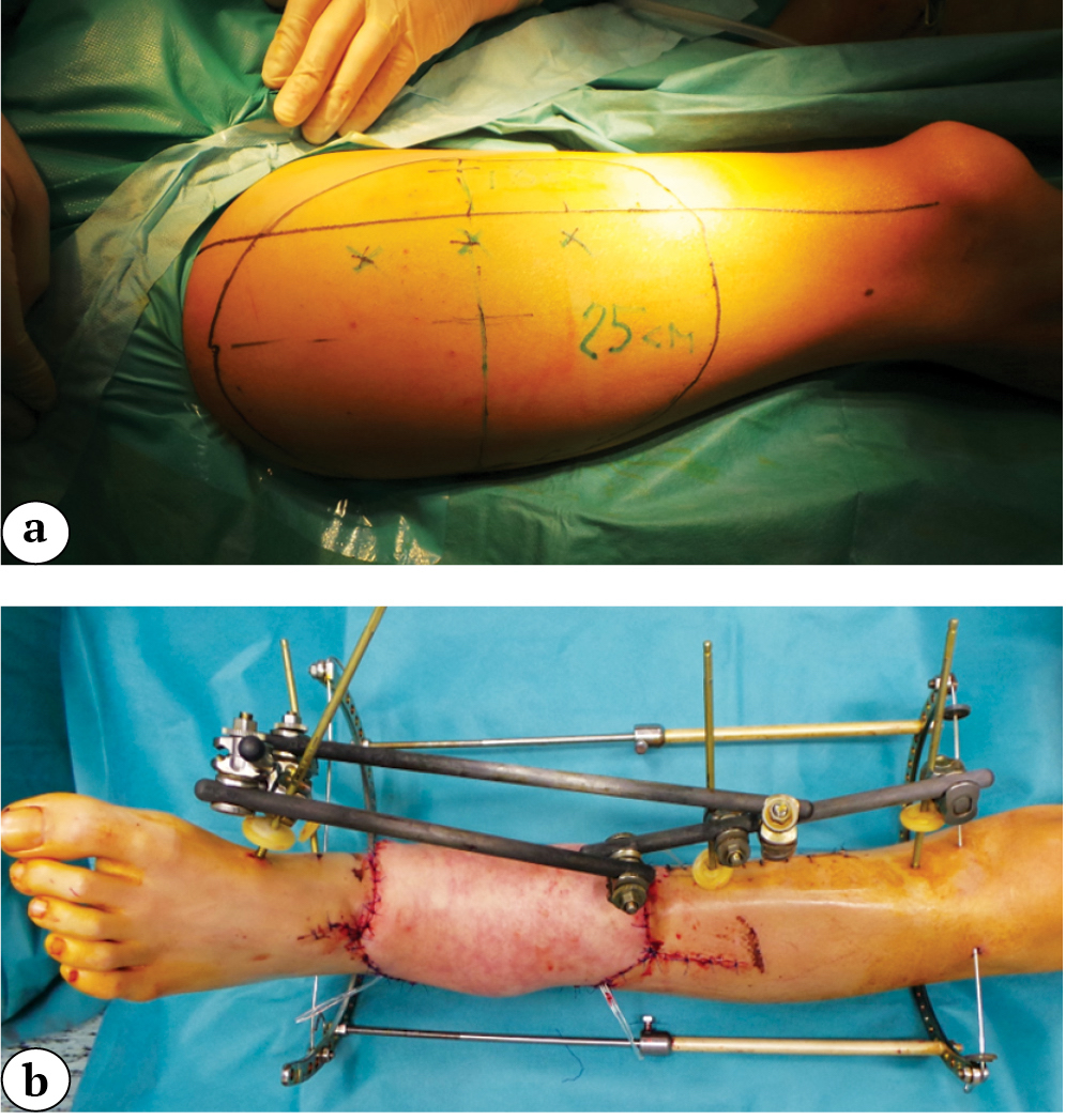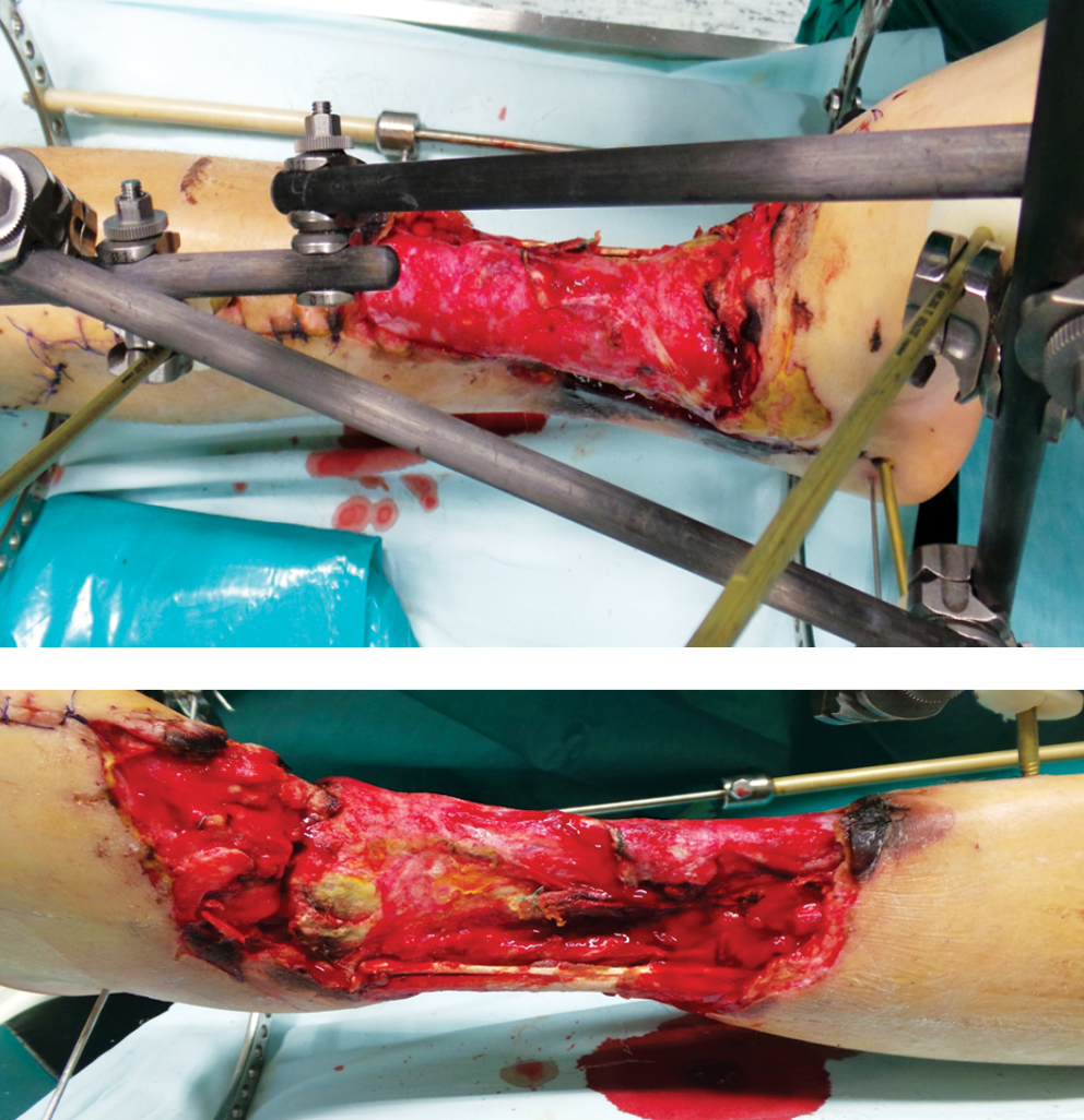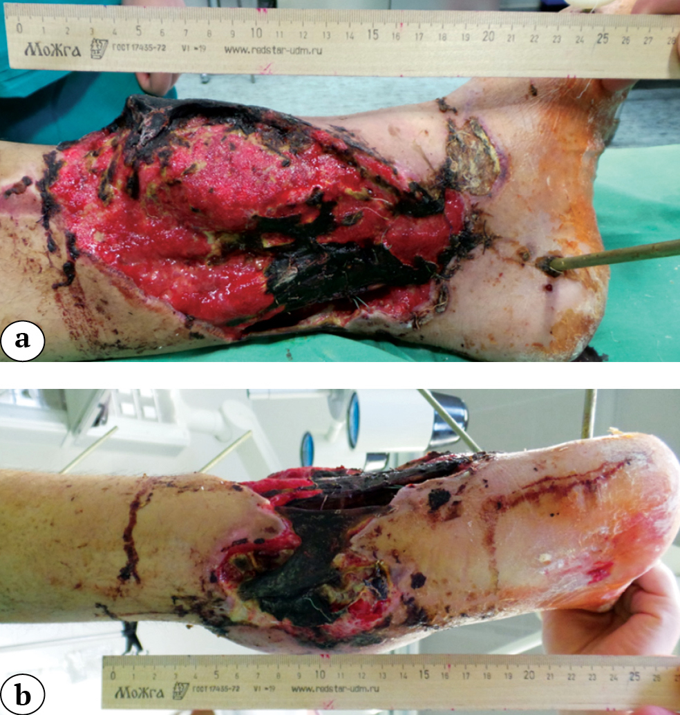 Patients with open fractures of the lower leg bones associated with extensive soft tissue defects rightfully belong to one of the most difficult categories of patients in traumatology and reconstructive surgery of the limbs [1]. The most frequent cause of such injuries are high-energy traumas that occur in everyday life as a result of road and railway accidents, and in wartime as a consequence of mine blast and gunshots. Extensive damage to tissues, significant contamination of wounds, vascular and nerve damage are high-risk factors for delayed fracture healing and development of infectious complications [2]. To save the limb, it is necessary to evacuate the patient as soon as possible to a specialized medical care center, to cooperate the work of specialists in the field of traumatology and orthopedics, vascular, plastic, septic and neurosurgery. At the same time, the problems of surgical wound treatment and its stages, preparation of the wound surface for plastic closure, choice of tissue complexes are priorities in the struggle for limb salvage. It should be noted that knowledge of the entire arsenal of reconstructive surgery methods, including the use of microsurgical techniques, allows to successfully restore the integrity of damaged tissues even in conditions of wound infection [3].