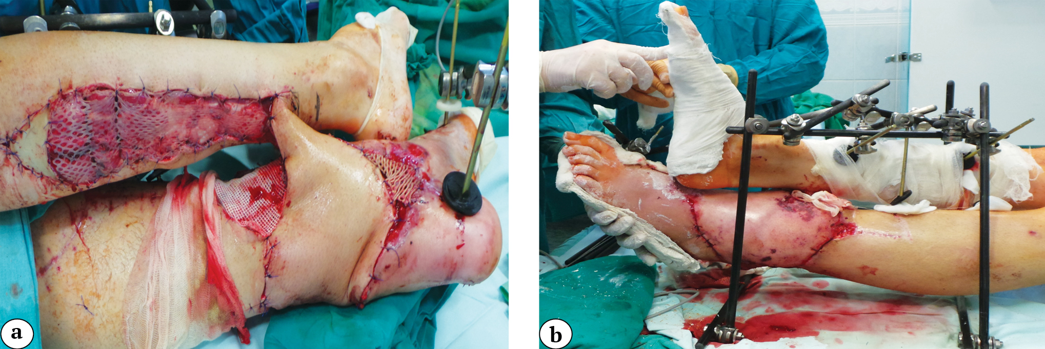 Fig. 6. Lower limb view after transposition of a vascularized sural flap from a healthy limb (a); fixation of both lower limbs in a frame-type external fixator in suspension (b)