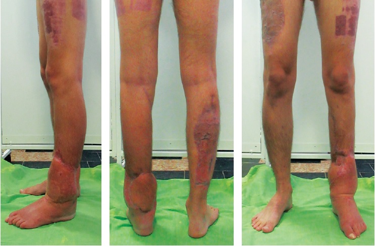 Conclusion. Presented clinical case demonstrates the possibility of successful replacement of an extensive circular defect of the distal lower leg using sequentially free and non-free vascularized tissue complexes.