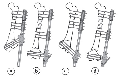 Figure 1. Schematic diagrams of the surgical technique: a, c — the Micrometric Swiveling Clamp (MSC) was set to a desired angle from the axis of the rail, and the distal half-pins were inserted in the plane of varus or valgus deformity; b, d — distal deformity was corrected through the MSC, and lengthening was performed gradually through two proximal clamps