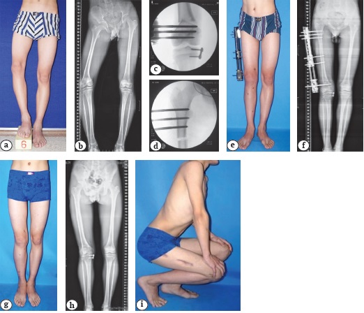 The combined occurrence of distal femoral malalignment deformities (varus and valgus) with limb-length discrepancy can be caused by congenital anomalies, metabolic disorders, post-traumatic sequelae, and adolescent Blount’s disease [1]. With the development of distraction osteogenesis, both deformity correction and limb-lengthening can be performed simultaneously. This novel procedure is being increasingly preferred not only by experts due to the technical advance it implies, but also by patients. In recent publications, circular external fixation, motorized intramedullary nailing followed by distal femoral locking plate, and fixator-assisted intramedullary nailing have been introduced as alternative methods to this procedure [2, 3, 4]. However, they present disadvantages. Circular apparatus is technically demanding, bulky, and uncomfortable owing to its size. A motorized intramedullary nail is appropriate for femoral lengthening [5], but its use is limited for the correction of concomitant malalignment deformities, which has to be performed with the assistance of other fixation methods. Moreover, motorized nailing is not currently available in the mainland of China.