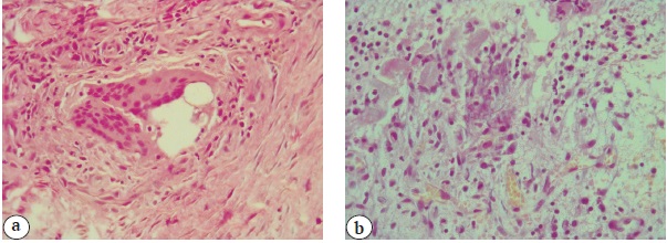 Рис. 1. Морфологическая картина гистологических препаратов, световая микроскопия: а — гигантоклеточная воспалительная реакция в участках отложения солей мочевой кислоты. b — мелкие игольчатые кристаллы в синовиальной оболочке. Окраска гематоксилином и эозином. Ув.: а — ×200; b — ×400