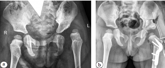 Fig. 2. X-rays of hip joints of patient born in 2018 with hip dysplasia IHDI type IV in an anterior-posterior projection: a — before surgery; b — after surgical treatment using Salter’s osteotomy