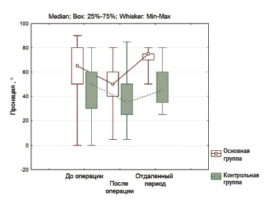 Так как большинство собранных признаков были количественными, но имели несимметричное распределение, далекое от нормального, то данные в таблицах представлены в виде медианы [Q1; Q3]. Для поперечного сравнения всех показателей применен критерий Манна – Уитни. Для сравнения показателей в динамике применен критерий Вилкоксона к первой и третьей временным точкам исследования (до операции и в отдаленном периоде).