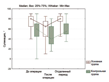 Рис. 4. Диаграмма размаха значений по показателю супинации в трех точках наблюдения (до, после операции и в отдаленном периоде наблюдения) в основной и контрольной группах