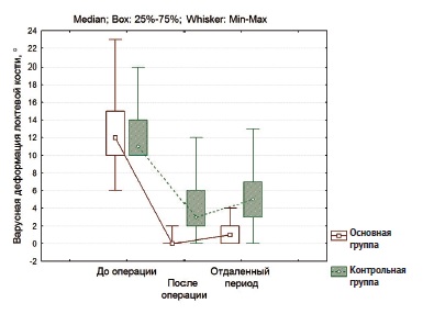 Рис. 5. Диаграмма размаха значений варусной деформации локтевой кости в трех точках наблюдения в основной и контрольной группах