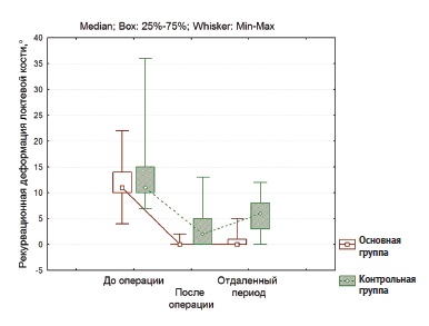 Рис. 6. Диаграмма размаха значений рекурвационной деформации локтевой кости в трех точках наблюдения в основной и контрольной группах