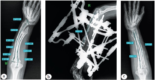 Рис. 8. Рентгенограммы правого предплечья: а — до операции; b — после выполненной коррекции деформаций локтевой кости (с наложенной навигационной системой Орто-СУВ); c — после снятия АВФ (через 9 мес. после операции)
