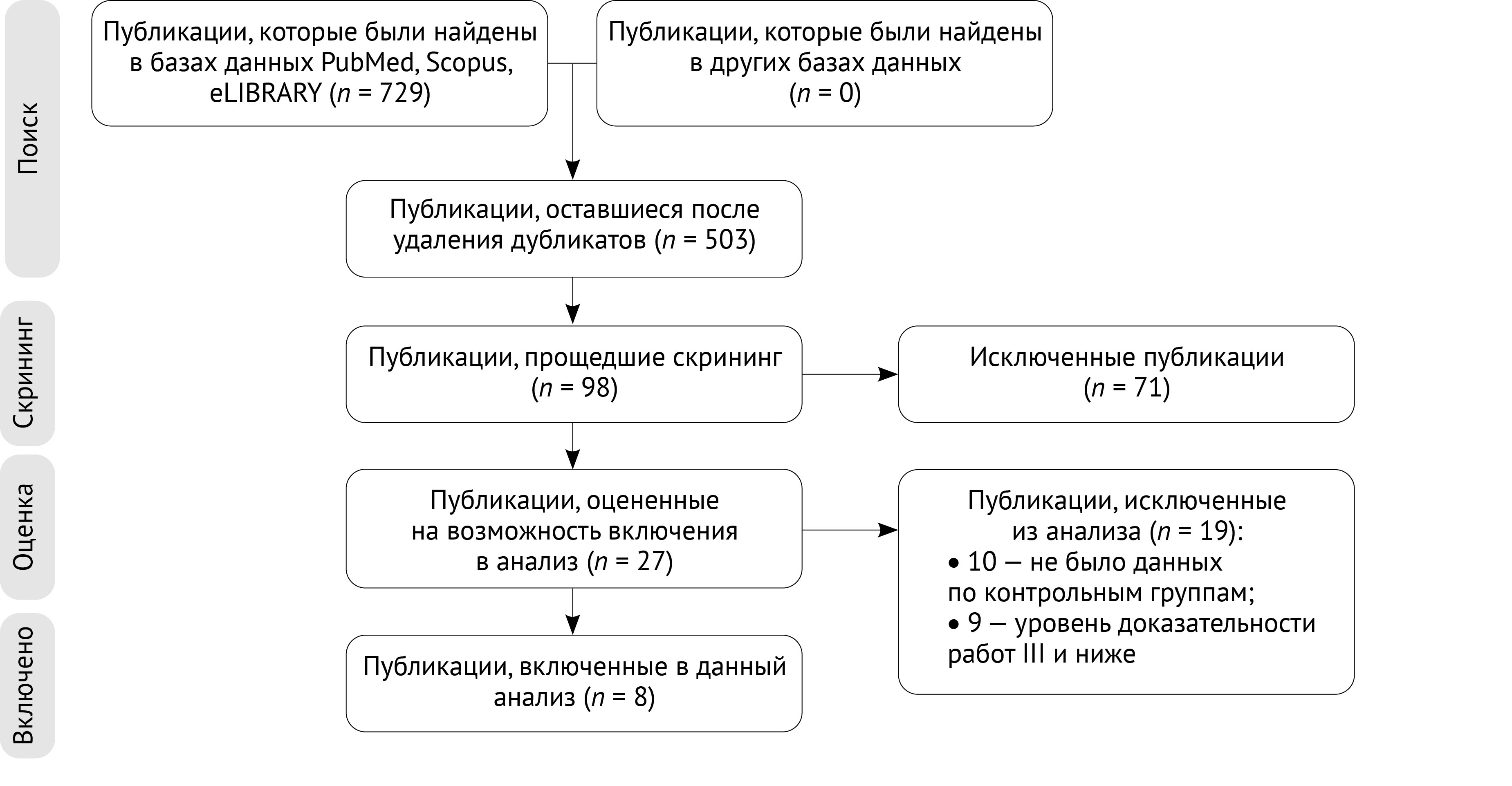 При поиске литературы в базах данных для проведения исследования было найдено 729 публикаций. Из них 503 публикации остались после исключения дубликатов, 98 публикаций были изучены, проведен анализ работ на соответствие критериям включения. После детального изучения было отобрано 8 полнотекстовых публикаций. По окончании рассмотрения исследований по критериям включения и невключения была составлена блок-схема (рис. 1).