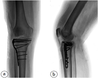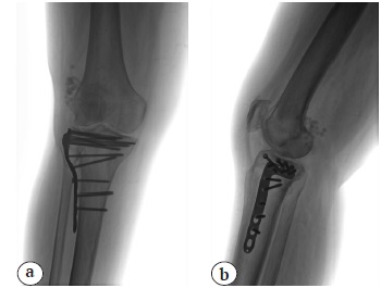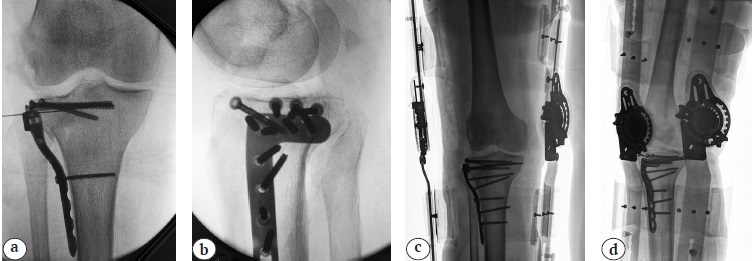 Fig. 2. X-rays of the right knee; satisfactory reduction of the tibial plateau fragments is observed: a — intraoperative X-ray in AP view; b — intraoperative X-ray in lateral view; c — postoperative X-ray in AP view; d — postoperative X-ray in lateral view