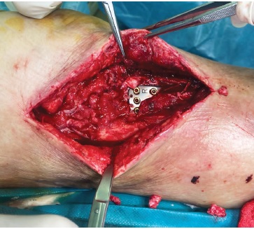 Операция выполнена на 12-е сут. после травмы по запланированной технике. Под спинномозговой анестезией на фоне периоперационной антибиотикопрофилактики цефуроксимом 1,0 г внутривенно, из положения на спине с согнутым коленным суставом на треугольном валике-подставке переднелатеральным доступом обнажено место перелома латерального мыщелка левой ББК. После отведения фрагмента латерального мыщелка выявлена центральная импрессия фрагментов суставной поверхности. Произведены реимпакция суставной поверхности и заполнение дефекта аллокостью. После фиксации латерального мыщелка костодержателем субхондрально установлено четыре стягивающих винта диаметром 4,0 мм. Установлена опорная мыщелковая пластина с проксимальной фиксацией пятью и дистальной фиксацией тремя винтами с угловой стабильностью диаметром 3,5 мм, после чего рана ушита послойно наглухо без дренирования (рис. 2). Время операции составило 180 мин., турникет не использовался.
