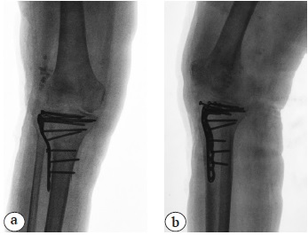 Fig. 7. X-rays outcome of the treatment, 2 years after surgery: a — AP view; b — lateral view