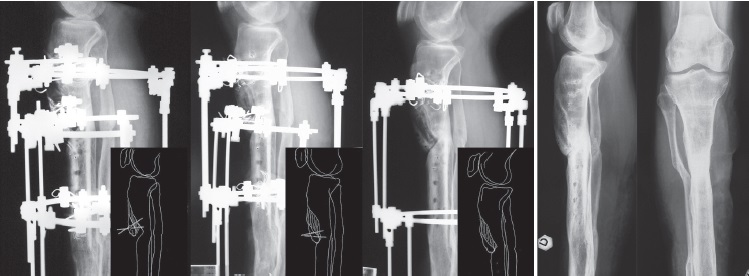 We decided not to open the nonunion site; we applied the Ilizarov apparatus for closed progressive realignment and compression. After 6 months, the fracture was still not healing, pin tracts were infected. So we opted for a surgical revision and resection of a 7 cm long segment of necrotic bone. A distal osteotomy was performed for segmental defect reconstruction with bone transport. At the end of bone transport, X-rays showed a poor contact at the docking site with an anteromedial partial defect of 4.5 cm (Figure 1). We decided to use the technique of fragment transport to deal with this mismatch and increase stability of the docking site. We performed a partial osteotomy of the anterior aspect of the tibia for setting up an anterior fragment to be transported from proximal to distal. The fragment was fixed with two 1.8 mm olive K-wires and connected to a 5/8 ring for progressive bone transport. The frame was removed 5 months later when docking site union was achieved. We observed a gradual bone remodeling during following months (Figure 2). At the last follow-up, four years after frame removal, the patient had a residual equinus deformity of the foot. No recurrence of infections or other complications were observed.
