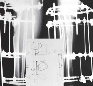 We first visited this patient five months after the injury presenting dehiscence of the plate removal wound. The diagnosis was a Cierny-Mader type III osteomyelitis. Anterior resection of necrotic bone was performed and resulted in a partial bone defect of the proximal metaepiphysis. We percutaneously performed a partial osteotomy of the anteromedial cortex. The continuity of the posterior cortex was maintained (Figure 3). The Ilizarov apparatus was applied to ensure stability, the fixation was extended to distal femur because the defect was too proximal to achieve a good stability of the proximal ring. The fragment was fixed with two 1.8 mm olive K-wires and connected to a half-ring for progressive bone transport from distal to proximal (Figure 4).