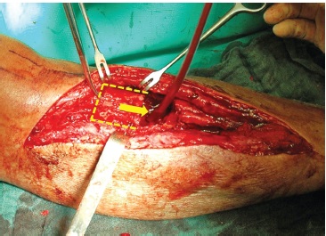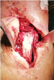 Figure 5. Picture taken after 4 cm long partial anterior resection. A partial osteotomy of the anterior aspect of the tibia was performed to set up the fragment to be distracted from proximal to distal