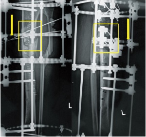 Follow-up X-rays were taken every two weeks during transport of the bone fragment. After that, the X-rays were taken every month until rigid consolidation of the osteotomized site was observed.
