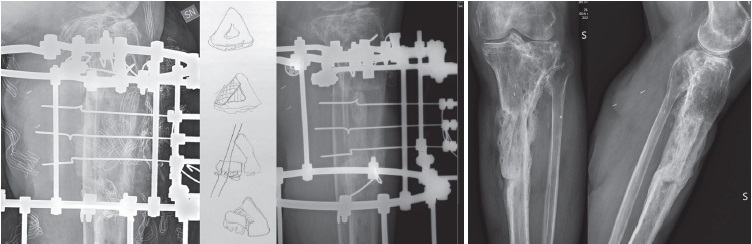 We first visited this patient after plate removal still presenting a draining sinus tract. The diagnosis was a Cierny-Mader type III osteomyelitis. We operated this patient in six months after the injury. A partial anterior resection of a 4 cm long segment was necessary. We performed a partial osteotomy of the anterior aspect of the tibia for setting up an anterior fragment to be transported from proximal to distal (Figure 6). The continuity of the posterior cortex was maintained. We finally applied the Ilizarov apparatus to ensure stability; the fragment was fixed with two 1.8 mm olive K-wires and connected to a half-ring for progressive bone transport (Figure 7, 8). The frame was removed less than in 5 months after the surgery when union was achieved. The patient’s last follow-up was at 4 years after frame removal with no reported recurrence of infections or other complications (Figure 9).
