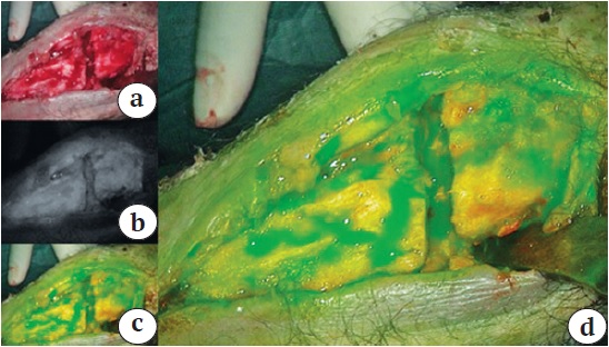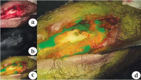 4. Fig. 3. Nonunion site after bone resection. Pictures show the normal view (a), lights off (b), and monitor view with lights off with the infrared lamp on (c, d)