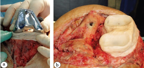 In the group 1 intraoperatively fabricated cement liner was installed between the officinal femoral and tibial implants (Fig. 3).