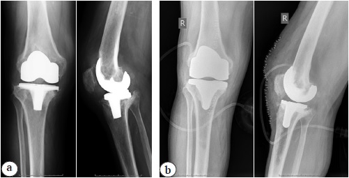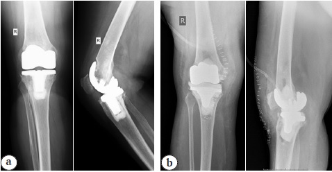 Active knee motions were evaluated in patients right before spacer implantation and 3 months after the surgery. Null method of examination was applied. Stability of spacer components was evaluated analyzing x-rays. Resorption at the cement-on-bone (metal-on-bone) borderline and axial alignment of components in anteroposterior and lateral views were assessed in comparison with postoperative x-rays. Visual analogue 10-point scale (VAS) was used to measure pain intensity. The survey took place on the 1st and the 7th days and on the day of discharge.