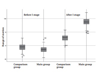 Fig. 5. The range of knee motions before and after the first stage of surgical treatment