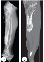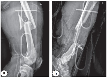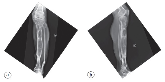 Figure 1. X-rays show a diaphysis fracture of the right femur (a) and fracture and bone defect of the distal third of the tibia and fibula (b)