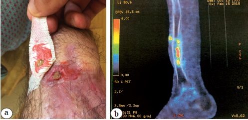 Figure 3. Clinical signs of infection with sinus and drainage (a); FDG PET-CT shows and confirms infection with uptake at the level of previous docking site (b)