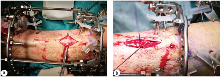 Figure 7. Surgical field views. Atypical length of the patellar tendon in continuity with the distal fragment of transported bone (a). Z-plasty of patellar tendon to restore the correct patella height. On the right side of the picture, K-wires blocking the patella at the correct height are observed (b)