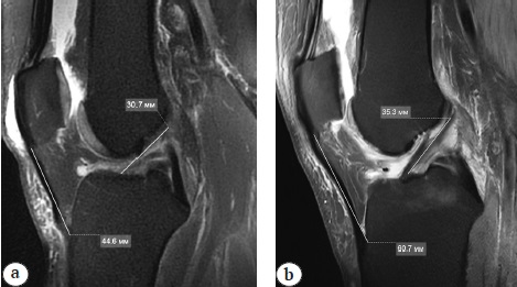 Рис. 1. Различные варианты длины связки надколенника: а — 44,6 мм; b — 60,7 мм