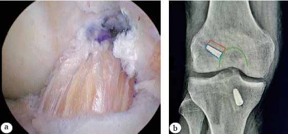 Рис. 2. Расположение трансплантата и интерферентного винта по отношению к наружному мыщелку бедра: а — артроскопическая картина; b — рентгенологическая картина