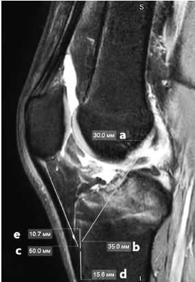 Рис. 3. МРТ-измерения: предполагаемая длина поврежденной передней крестообразной связки (a), предполагаемая длина костного тоннеля в большеберцовой кости (b), длина сухожильной части связки надколенника (c), длина дистальной части блока большеберцовой кости (d), длина проксимальной части костного блока большеберцовой кости (e)