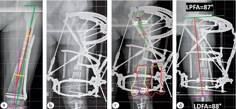 Figure 1. The spring technique in correction of biapical femoral deformity: a — planning for deformity correction using anatomical axes (axes of the fragments are marked in green, red and purple, osteotomies levels — in yellow); b — after application of orthopedic hexapod and osteotomies; c — calculation in the computer program (a yellow contour indicates the initial position of the mobile fragment, a red one — after correction); d — the correction result