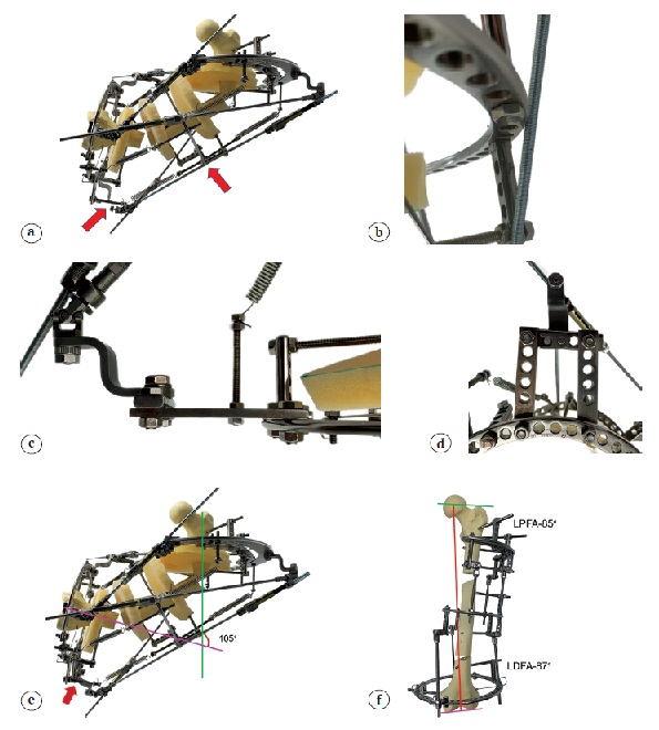 Рис. 2. Увеличение коррекционных возможностей при помощи приставки: а — крепление кардана к платику невозможно ввиду столкновения страты с промежуточной опорой (отмечено стрелками); b — столкновение страты с опорой; c, d — фиксация страты IV при помощи приставки; e — использование приставки позволило избежать контакта страты с промежуточной опорой, кардан успешно фиксирован к платику (отмечено стрелкой); f — для снижения громоздкости конструкции после завершения коррекции выполнен демонтаж дуги Илизарова, пружин и фиксационной приставки, а страты заменены на двухплоскостные шарниры