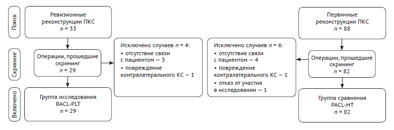Критерии невключения для обеих групп: мультилигаментарное повреждение коленного сустава (КС), остеоартроз КС 2–3 ст., вальгусная и/или варусная деформация коленного сустава (>5°), повреждение медиального и/или латерального мениска по типу bucket handle tear или разрыв корня мениска. Дополнительные критерии невключения для группы RACL-PLT: передний наклон плато большеберцовой кости (>12°), двухэтапное ревизионное вмешательство.