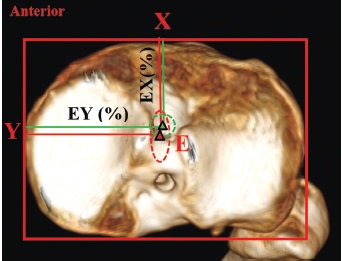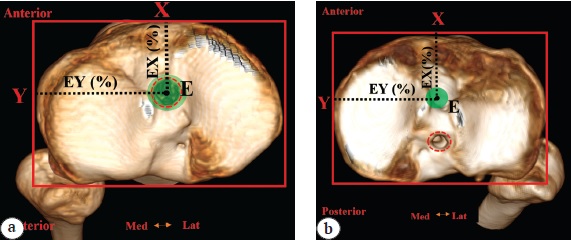 EX (%) — расстояние от переднего края плато большеберцовой кости в процентах; EY (%) — расстояние от медиального края плато большеберцовой кости в процентах; Gh (%) — расстояние от наиболее глубокой точки медиального края латерального мыщелка бедренной кости в процентах; Gt (%) — расстояние от линии Blumensaat в процентах.