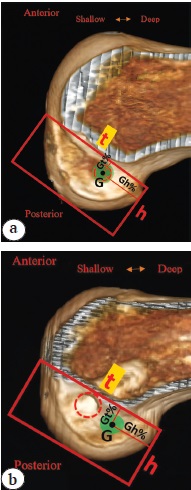 Fig. 3. Schematic representation of the interposition of the entries into the primary and planned femoral tunnels to make a decision on performing a one-stage ACL revision: a — the planned entry into the revision tunnel (marked in green) completely coincides with the entry into the primary tunnel (marked in red), the diameter of the primary tunnel <10 mm; b — the planned entry into the revision tunnel (marked in green) does not coincide with the entry into the primary tunnel (marked in red); G — position of the central attachment point of the native ACL on the femur according to the square method of M. Bernard et al. [22]; Gh (%) — distance from the deepest point of the medial edge of the lateral femoral condyle (29.9%); Gt (%) — distance from the Blumensaat’s line (30.1%)