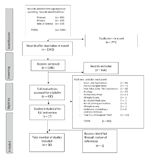 The following types of studies utilising 3-dimensional (3D) printed patient-specific guides intra-operatively for orthopedic procedures were included: randomised controlled trials, non-randomised controlled trials, observational studies, case reports, and in vitro studies. The following exclusion criteria were applied for screening and full text review: non-medical 3D printing applications; 3D printing applications in a non-medical setting; full text unavailable, conference abstract only; dental, spinal surgery, general surgery, thoracic surgery, maxillofacial surgery, or veterinary applications; 3D printed implants only; 3D printed surgical models only; and 3D bioprinting. The following exclusion criteria were applied for full text review: orthopedic applications outside the knee; total knee arthroplasty; or unicompartmental knee arthroplasty. The Covidence software (Melbourne, Victoria, Australia) was utilized for screening of studies. Two independent reviewers screened titles and abstracts based on the criteria described. Studies were assessed as eligible by voting “yes”, “maybe”, or “not eligible”. All voting was blinded and all references deemed eligible were carried forward for full text review. Discrepancies between the reviewers were resolved by discussion and consensus; indeterminate studies were carried forward into full text screening stages.