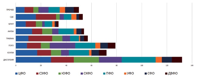 Fig. 1. Distribution of patients with a particular hip joint disease that caused the development of end-stage hip osteoarthritis by the federal districts of the Russian Federation