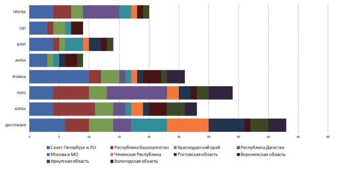 Лидирующими регионами по направлению в клинику Центра пациентов с терминальной стадией диспластического коксартроза были Санкт-Петербург и Ленинградская область, Ростовская область, Краснодарский край и республика Башкортостан. Пациенты, нуждающиеся в проведении ТЭТС в результате перенесенного ЮЭГБК, в подавляющем большинстве поступали из республики Башкортостан, а с последствиями ОГО — из республики Дагестан. Большинство детей с последствиями травматических повреждений области тазобедренного сустава в виде грубой деформации тазового и бедренного компонентов и клинико-рентгенологическим признаками коксароза 3-й стадии, к сожалению, являлись жителями Санкт-Петербурга и Ленинградской области, что может косвенно свидетельствовать о недостаточном уровне подготовленности специалистов к оказанию адекватной помощи детям с травмами области тазобедренного сустава.