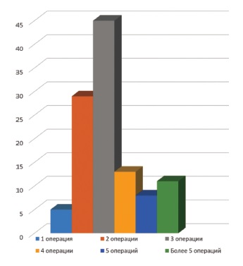Рис. 3. Распределение пациентов с дисплазией тазобедренных суставов по количеству выполненных операций