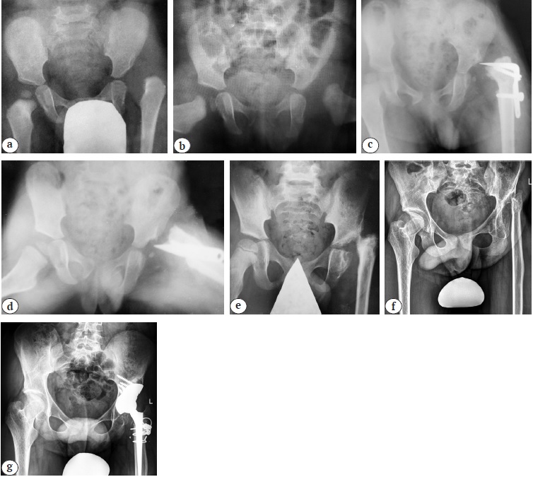 Fig. 5. Surgical interventions sequence of a 16-year-old patient: a — X-ray of the hip joints at the initial specialist visit at the age of 11 months (grade III-1 left-sided hip dysplasia according to the supplemented D. Tönnis classification); b — an attempt at conservative treatment (closed hip reduction under anesthesia with a plaster cast put in the Lorenz position 1) — reduction has not been achieved; c, d — short-term result of the left hip joint surgical reconstruction (reluxation with lysis of the proximal femur due to damage of medial circumflex femoral artery caused by perforation of the posterior surface of the femoral neck with a blade plate); е — mid-term result of the surgical treatment (pathological dislocation with absent proximal epiphysis, femoral neck and forming secondary deformation of the acetabular arch); f — X-ray of the hip joints just before total arthroplasty (gross deformation of the acetabulum, extremely small femoral canal sizes); g — mid-term result of cementless THA performed with the Zimmer Biomet system (Continuum® cup 44 mm; Trabecular metal support augment 50-30 mm, Wagner cone® 13, ceramic-crosslinked polyethylene), the T. Paavilainen techniques of greater trochanter osteotomy and dilated osteotomy of the femur