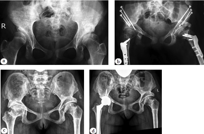 Fig. 6. X-ray series of the hip joints of a 16-years-old patient: a — before reconstructive intervention (Crowe I grade bilateral dysplastic hip subluxation); b — after correcting osteotomy of the femur (detorsion-varus), triple pelvic osteotomy on both sides (accompanied by hypercorrection of acetabulum positioning, external rotational position of the lower extremities, which may indicate small values of the proximal femur anteversion); с — X-ray just before THA (total joint space narrowing with total retroversion of the acetabulum); d — mid-term result of THA performed with the Zimmer Biomet system (Continuum® cup 50 mm; Wagner cone® 15, ceramic-crosslinked polyethylene)