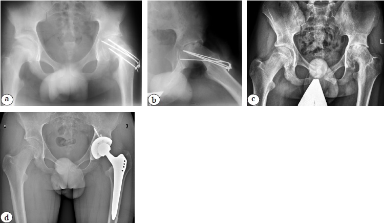 Рис. 7. Серия рентгенограмм тазобедренных суставов пациента 14 лет с левосторонним коксартрозом 3 стадии в результате лечения ЮЭГБК: a, b — через 6 мес. после выполнения закрытой репозиции с фиксацией пучком спиц (отмечается неустраненное смещение головки бедренной кости по отношению к шейке со значительным сужением суставной щели и мальпозицией спицы Киршнера); c — непосредственно перед проведением эндопротезирования (помимо классических признаков коксартроза 3 стадии, отмечаются характерные для хондролиза вертлужной впадины ее протрузия с краниальном смещением головки бедренной кости); d — среднесрочный результат выполнения тотальной бесцементной артропластики системой Zimmer Biomet (чашка Trilogy IT® 62 мм; ножка Alloclassic® 6, пара трения — керамика — поперечносвязанный полиэтилен) c аутопластикой дна вертлужной впадины
