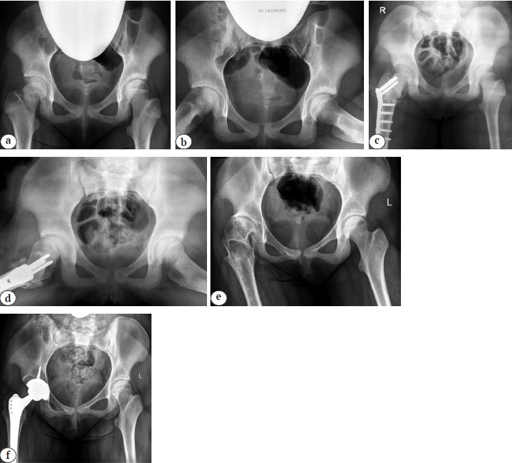 Рис. 4. История хирургических вмешательств у пациентки 14 лет: а — рентгенограмма тазобедренных суставов на момент первичного обращения к специалисту в возрасте 1 г. 7 мес. (дисплазия левого тазобедренного сустава IV–1 степени по дополненной классификации D. Tönnis [16]); b — ближайший результат хирургической реконструкции левого тазобедренного сустава (релюксация с выраженными дистрофическими явлениями в проксимальном отделе бедренной кости); c — повторная попытка стабилизации левого тазобедренного сустава (отсутствие концентрического вправления головки бедренной кости в вертлужную впадину, высокое положение большого вертела, мальпозиция металлоконструкций в виде их пенетрации в полость сустава); d, e — отдаленный результат хирургического лечения (тотальный лизис проксимального отдела бедренной кости, вертлужная впадина как анатомическая структура отсутствует, укорочение бедренной кости более 8 см, экстремально малые размеры канала бедренной кости и локации для имплантации чашки эндопротеза в анатомическую позицию); f — среднесрочный результат выполнения тотального бесцементного эндопротезирования системой Zimmer Biomet (чашка TMT® 38 мм; ножка Wagner cone® 13, пара трения: металл — поперечносвязанный полиэтилен) с применением техник остеотомии большого вертела по T. Paavilainen и дилятационной остеотомии бедренной кости