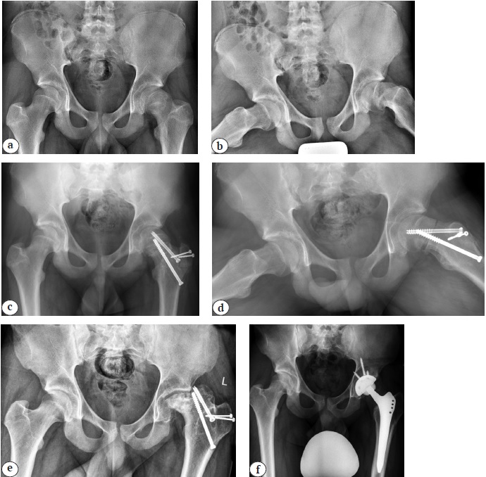 Рис. 9. Серия рентгенограмм тазобедренных суставов пациента 16 лет с левосторонним коксартрозом 3-й стадии в результате лечения ЮЭГБК: a, b — рентгенограммы в переднезадней и аксиальной проекциях на момент первичного обращения в один из стационаров (смещение головки правой бедренной кости кзади на 63° с формированием остеофита в месте перехода «головка — шейка», признаки синтозирования физарного хряща эпифиза); c, d — рентгенограммы в переднезадней и аксиальной проекциях непосредственно после проведения внутрисуставной корригирующей остеотомии шейки бедренной кости (восстановлены пространственные соотношения в системе «вертлужная впадина — головка — шейка бедренной кости»); e — через год после проведения первичного хирургического лечения (признаки асептического некроза головки бедренной кости с ее грубой многоплоскостной деформацией и подвывихом бедра); f — среднесрочный результат тотального эндопротезирования системой Zimmer Biomet (чашка Trilogy IT® 48 мм; ножка Alloclassic® 5, пара трения керамика — поперечносвязанный полиэтилен)